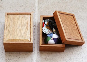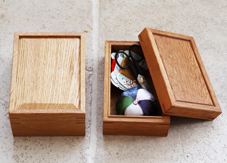 このナラ材、使い込んで経年することによって美しい色合いに変化します。二つ目の写真は新品の小箱とマダムが裁縫箱として約10年使い込んだものを比較しています。