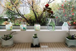 いよいよスタート、女性作家5人による明るく楽しいウキウキ感いっぱいの展覧会です。染色、シルバーアクセサリー、カラフルなガラスたち、山野草の寄植え、布を使った小物や洋服・・・見るだけでテンションが上がる作品が勢揃いしました。