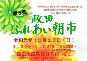 20日(日)は政田ふれあい朝市に出店! コメントを残す 10月20日(日)午前8時30分から11時まで開催の「政田ふれあい朝市」に今年も参加します。ギャラリーから北へ約300メートル、広く新しい道が2号線バイパスに交わる西側にある広場で開催します。我がギャラリーとしては自家焙煎コーヒーやスコーン、マンゴージュース、自家焙煎のコーヒー豆などを販売します。楽しいイベントもあり他にも盛りだくさんのお店が出店します。皆様お誘い合わせでご来場ください。