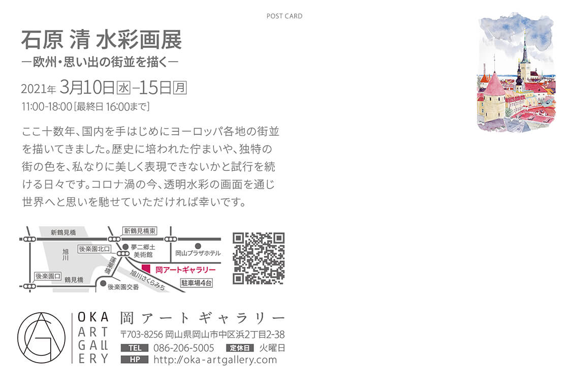 石原清がこのたび岡山市内、「旭川さくらみち」にある「岡アートギャラリー」において透明水彩画の個展を開催いたします。従来、我が田園ギャラリーにての展示が中心でしたが初の他画廊展示となります。3月10日(水)〜15日(月)時間の許す限り在廊のつもりです。お近くにお越しの節はどうぞお立ち寄りください。