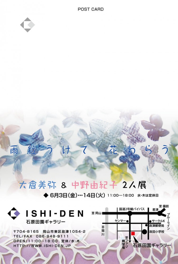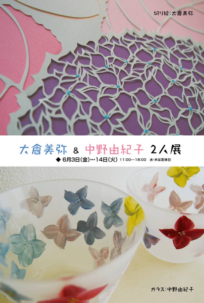 大倉美弥&中野由紀子 2人展終了 2016年6月3日(金)〜6月14日(火) (水曜日・木曜日は休み) ガラス作家の中野由紀子さん・切り絵作家の大倉美弥さん(いずれも岡山県内在住)の2人展を開催します。 梅雨の雨の中でいきいきと咲き競う花々をテーマに作品を展開していきます。 中野さんは食器・花器・アクセサリーを中心に100余点を、大倉さんは切り絵の額を約10点展示。いずれも販売いたします。 切り絵:大倉美弥 ガラス:中野由紀子 投稿ナビゲーション ← 暮らしのスパイス展2016 石原育子ポジャギ展2016 → ひとつ前のページに戻る