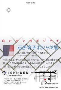 石原育子ポジャギ展2016終了 2016年7月1日(金)〜7月12日(火) (水曜日・木曜日は休み) 韓国でポジャギは風呂敷とかふくさの様な布のことをいいます。この中で小裂を継いでつくるポジャギは韓国のパッチワークといわれています。 韓国の伝統的手法に学びながら、現代生活に生かせる間仕切りや被い布、テーブルセンター等をモシと呼ばれる麻布で作ってみました。 総点数は40点程。展示・販売します。 石原育子 投稿ナビゲーション ← 大倉美弥&中野由紀子 2人展 イタリアを巡る 石原 清 水彩スケッチ展 → ひとつ前のページに戻る