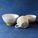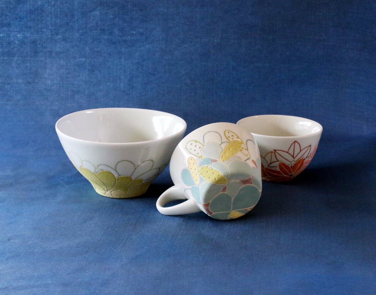 総社在住の磁器作家。白磁に線を刻んで色を入れた模様が楽しい。