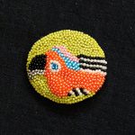 岡山市在住。ビーズを布に縫い付けてブローチを製作。図案と色に彼女の感性が現れています。
