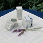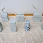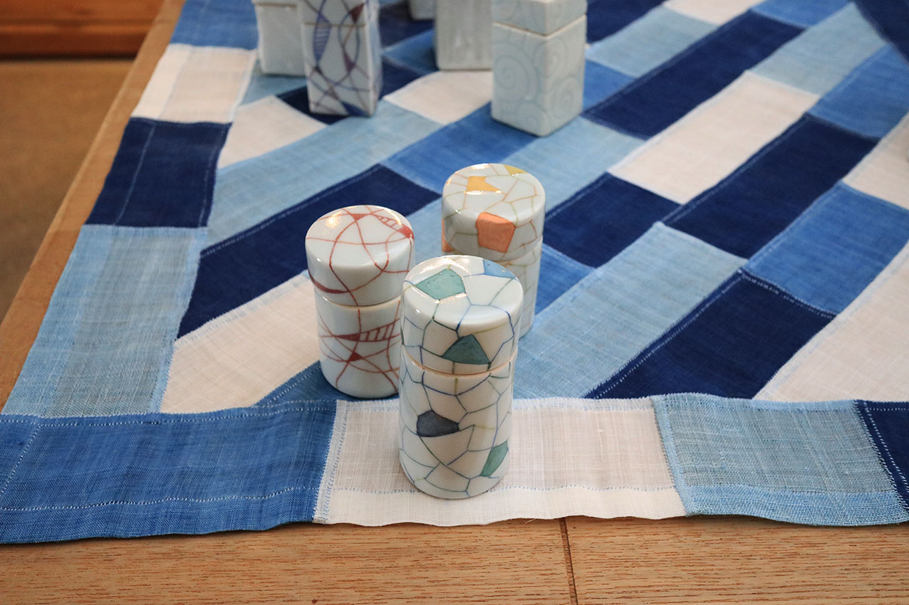 磁器は大切なものを入れる陶函や普段使いの器が並びます。ポジャギと磁器の組み合わせで夏を涼しげに演出できます。