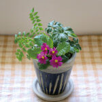 • ステキな鉢に山野草を寄植えしている西村孝子さん。数種類が寄植えされているので、身近において植物の成長をゆっくりと見ることができます。癒やし系のインテリアにぴったりです。