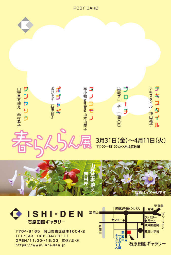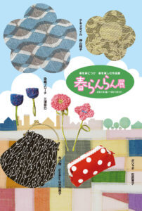 布バッグやブローチなど春の装いの必須アイテムやお部屋に春を取り入れる山野草等寄植えや被い布やテーブルセンター等、5人の女性作家の競演です。
