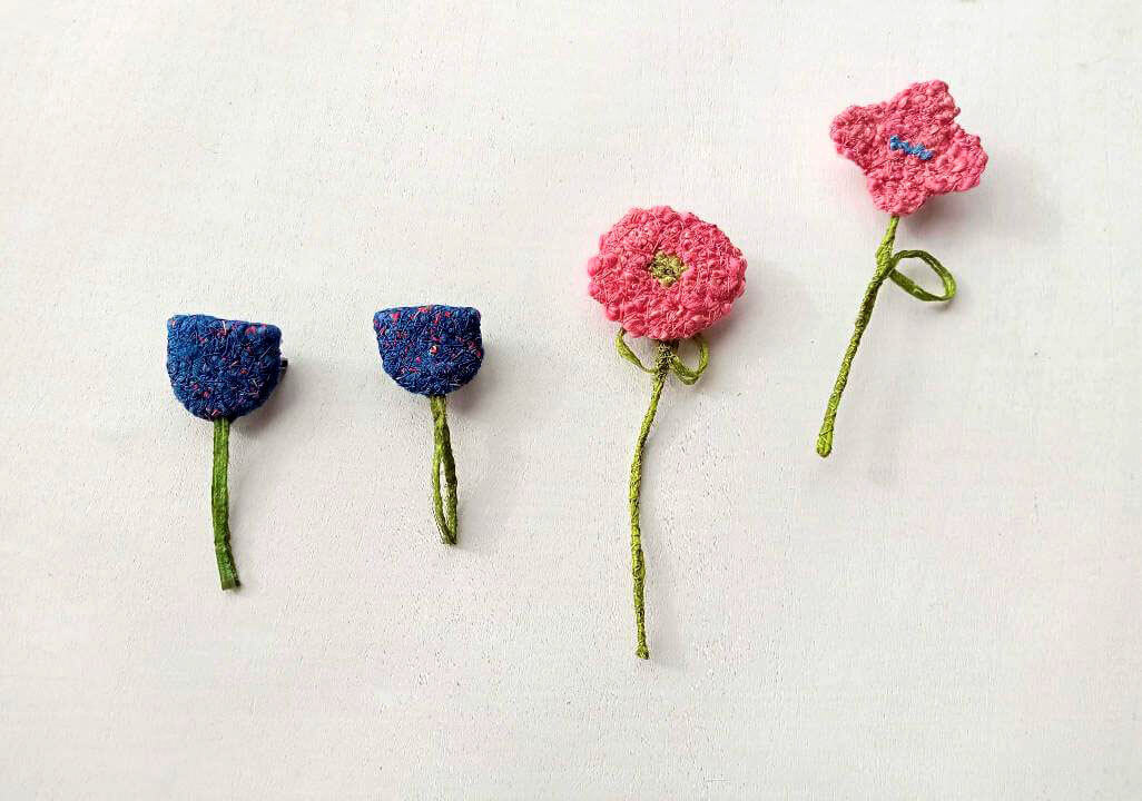 - 三浦奈巳 染めた絹糸を織ったり縫ったりしてつくったブローチやその他染織作品。