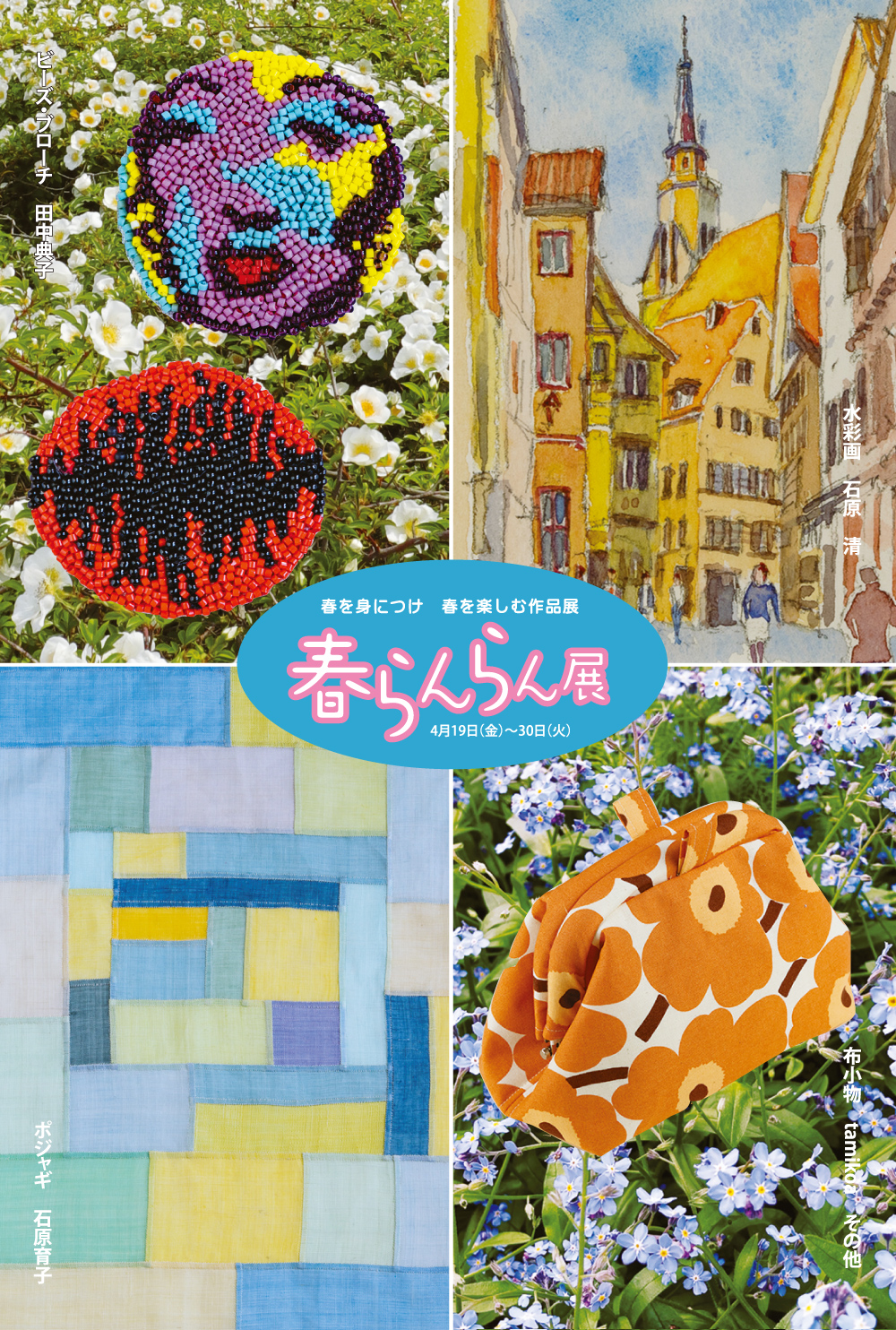春を迎え、気分転換やイメージアップに活かせる5人の作家の作品を展示します。出品作家と作品は次のとおりです。 石原育子 麻のポジャギ、春の光の中で透けた色が美しい。 石原清 ヨーロッパを描いた水彩画の小品と最近取り組んでい … 続きを読む 春らんらん展2024