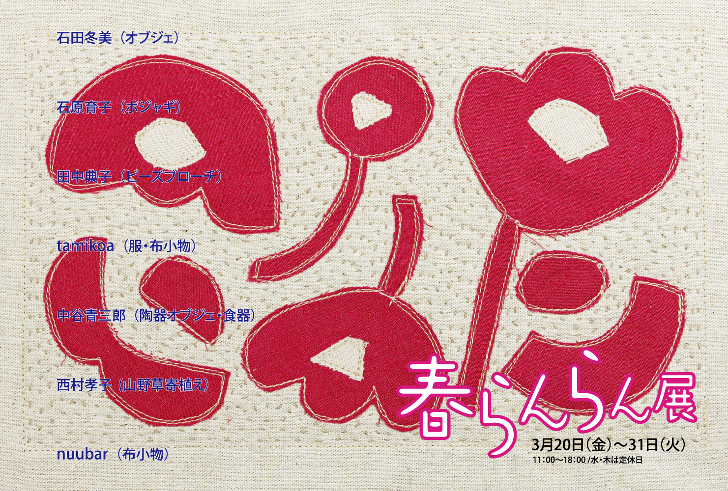 春の訪れとともに、室内を少し春らしく彩ったり、お出かけの装いにひと工夫を加えたり。日々の暮らしの中で、気分が明るく、生き生きとするような作品の数々を展示いたします。