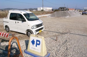 道路舗装工事のため、今日23日(日)はギャラリー駐車場へ入ることができません。そのため工事中道路に臨時の駐車場を設定しています。Pの看板を目印に、ハイゼットデッキバン「シロ号」が停まっている隣に駐車してください。大変ご不便をおかけしますがよろしくご協力ください。