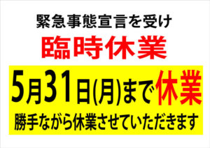 緊急事態宣言を受け、5月31日まで《臨時休業》いたします。