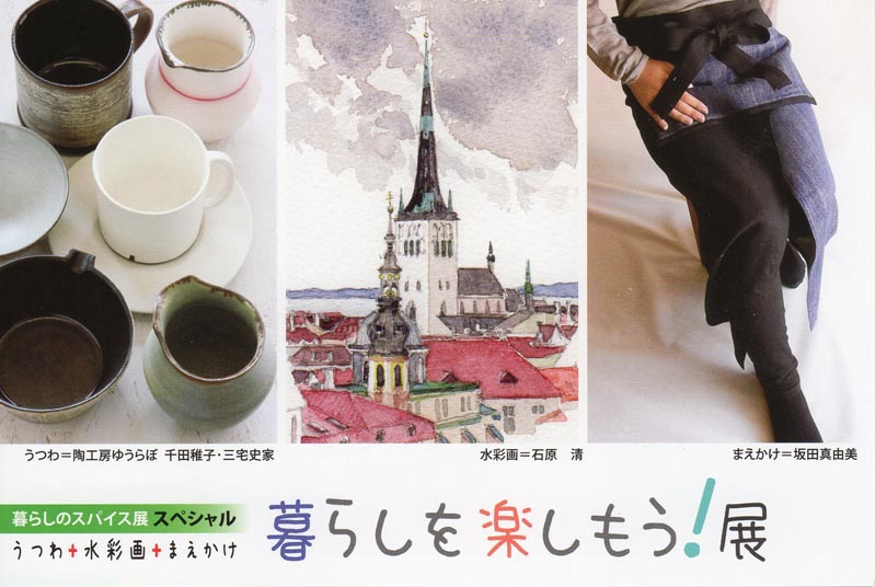 うつわと水彩画そしてまえかけ・・・「暮らしを楽しもう!展」。暮らしのスパイスを集めた展示会が始まりました。