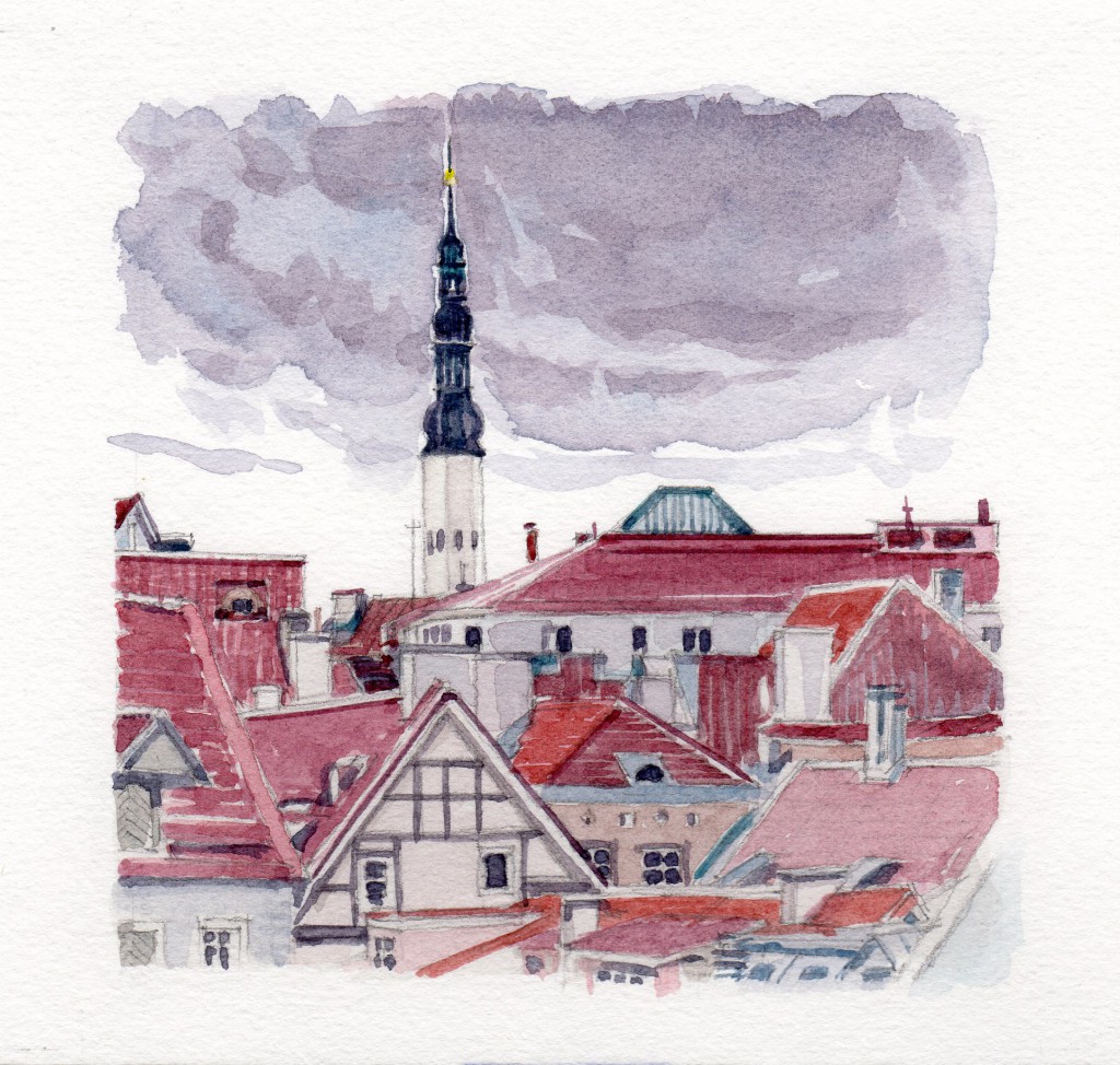 エストニアの首都タリンを描いた水彩画、スペースをとらないミニ額も用意しました。