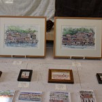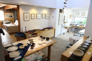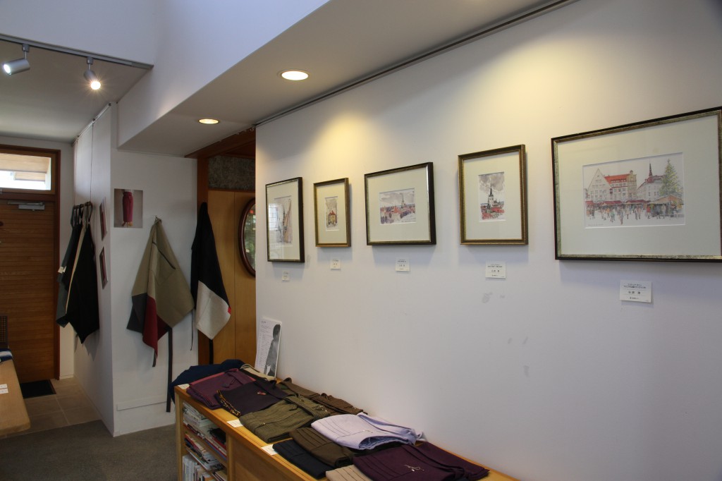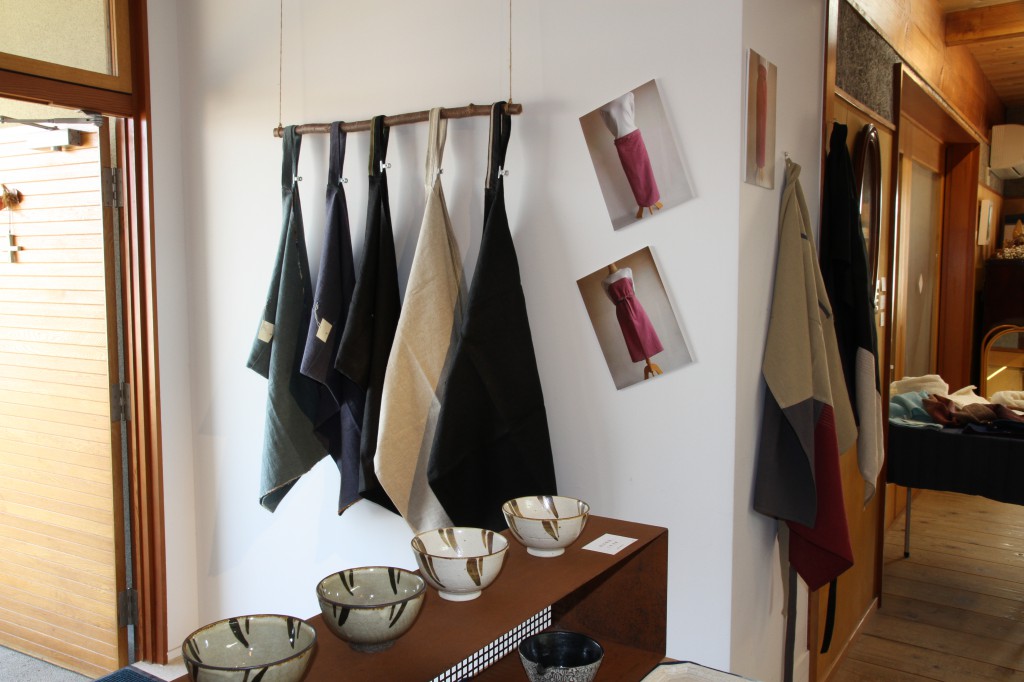 「暮らしを楽しもう!展」の会場風景です。うつわ、水彩画、まえかけ、3つのアイテムが同時に楽しめる企画展開催中です。