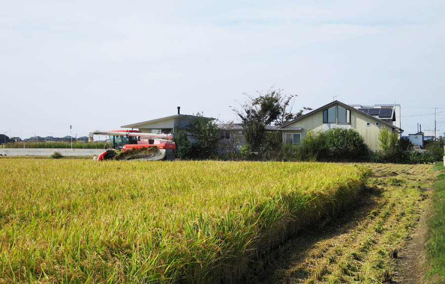 いよいよコンバインの登場です、稔った稲原をけっこうなスピードで収穫していきます。見渡す限りを一日あれば済ませてしまいます。