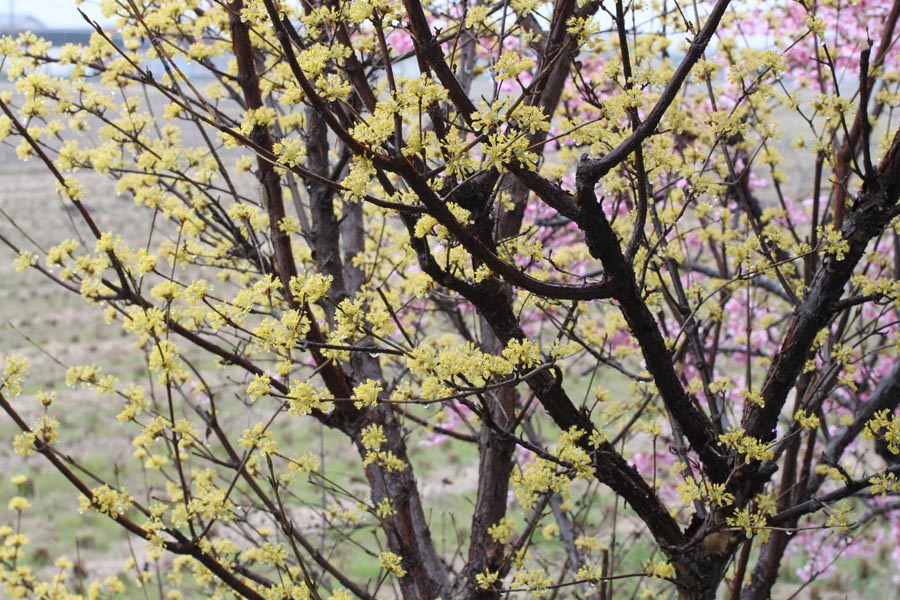 今日は少し寒くて朝から雨です。サンシュユの黄色とカワズザクラのピンクがなんとも春の色合い・・・そろそろ見納めかも知れませんね。